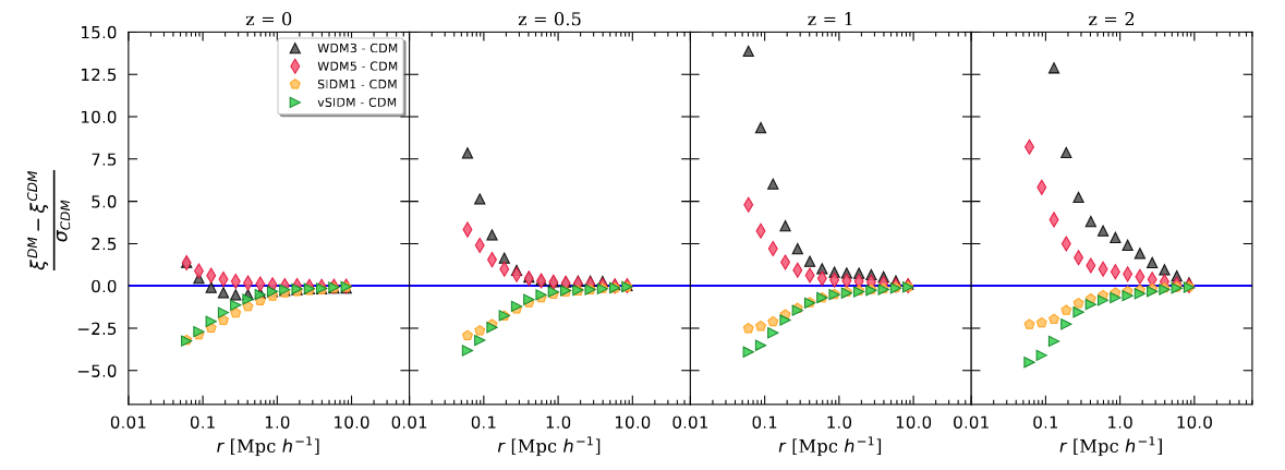 - Carlo Giocoli, Giulia Despali, Lauro Moscardini, Massimo Meneghetti, Ravi Sheth, Annalisa Pillepich, Mark Vogelsberger arXiv linkAbstract: The shapes of dark matter halos can be used to constrain the fundamental properties of dark matter. In standard Cold Dark Matter (CDM) cosmologies, halos are typically triaxial, with a preference for prolate configurations, particularly at low masses and high redshift. We focus on the characterization of total matter 3D shape in alternative dark matter models, such as Self-Interacting Dark Matter (SIDM) and Warm Dark Matter (WDM). These scenarios predict different structural properties due to collisional effects or the suppression of small-scale power. We measure the different halo component shapes -- dark matter, stars and gas -- at various radii from the center in the AIDA-TNG (Alternative Interacting Dark Matter and Astrophysics – TNG), which is a suite of high-resolution cosmological simulations built upon the IllustrisTNG framework. The intent is to systematically study how different dark matter models -- specifically, SIDM and WDM -- affect galaxy formation and the structure of dark matter halos, when realistic baryonic physics is also included. SIDM models tend to produce rounder and more isotropic halos, especially in the inner regions, as a result of momentum exchange between dark matter particles. WDM halos are also slightly more spherical than their CDM counterparts, and are typically less concentrated. In all cases, the inclusion of self-consistent baryonic physics makes the central regions of all halos rounder, while still revealing clear distinctions among the various dark matter models. The general framework presented in this work,based on the 3D halo shape, can be useful to interpret multi-wavelength data analyses of galaxies and clusters.