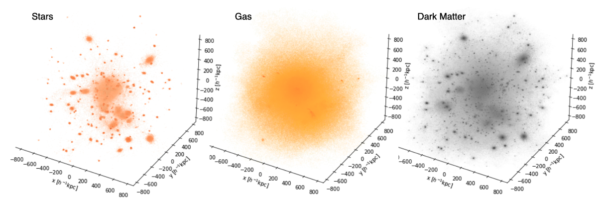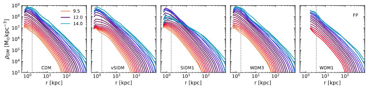 - Giulia Despali, Carlo Giocoli, Lauro Moscardini, Annalisa Pillepich, Mark Vogelsberger, Massimo Meneghetti arXiv linkAbstract: In the standard Cold Dark Matter (CDM) scenario, the density profiles of dark matter haloes are well described by analytical models linking their concentration to halo mass. Alternative scenarios, such as warm dark matter (WDM) and self-interacting dark matter (SIDM), modify the inner structure of haloes and predict different profile shapes and central slopes. We employ the AIDA-TNG simulations to investigate how alternative dark matter physics and baryonic processes jointly shape the internal structure of haloes. Using dark-matter-only and full-physics runs, we measure the dark matter density profiles of haloes spanning six orders of magnitude in mass, from 109.5 Msun to 1014.5Msun, considering radial bins that are well-resolved above. We fit the profiles with multiple analytical models and provide the distribution of the best-fitting parameters, as well as the concentration-mass relation in WDM and SIDM. The Einasto profile well reproduces the inner flattening produced in WDM models, both in the collisionless and in the full-physics runs. In SIDM dark-matter-only runs, haloes are better described by explicitly cored profiles, with core sizes that depend on mass and on the self-interaction model. When baryons are included, the differences between CDM and SIDM decrease, and such large dark-matter cores no longer form because adiabatic contraction in the baryon-dominated region counteracts self-interactions. Nevertheless, the coupling between baryons and self-interactions induces a broader range of inner slopes, including cases that are steeper than CDM at Milky Way masses. Alternative dark matter physics thus leaves clear signatures in the inner halo structure, even if baryons significantly reshape these differences. Our results are useful for future studies that need to predict the properties of haloes in multiple dark matter models.